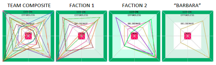 The survey revealed a deeply skewed team, self-evaluating at opposite ends of the spectrum on many items. The highest was technical competence; the lowest three were trust, external recognition, and leadership effectiveness also skewed toward extremes. In the composite of 5 Dynamics Energies, the team appears balanced, but just below the surface are two different factions comprising 10 people who have much different outlooks on the world. The teams’ scores appear below. Barbara’s inability to see “beyond her own Energies” contributed to her difficulty in knowing what was wrong and what to do about it.