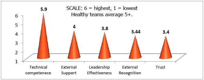 5 Dynamics developed a three-part strategy: measure / meet / follow up. First, the teammates anonymously completed our team assessment, measuring the group’s view of its performance in terms of factors critical to their success. The lowest scores emerged in the areas of trust, external recognition, and leadership effectiveness. A subset of average scores appears below: